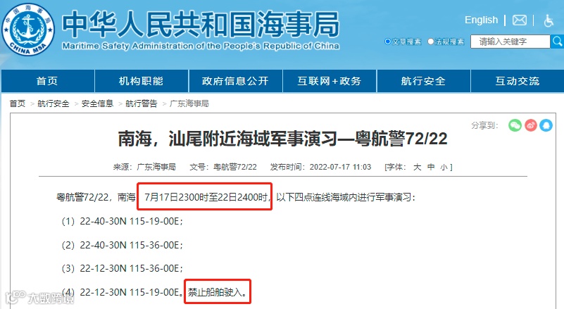据广东海事局消息:粤航警72/22 南海,7月17日2300时至22日2400时,以下四点连线海域内进行军事演习: