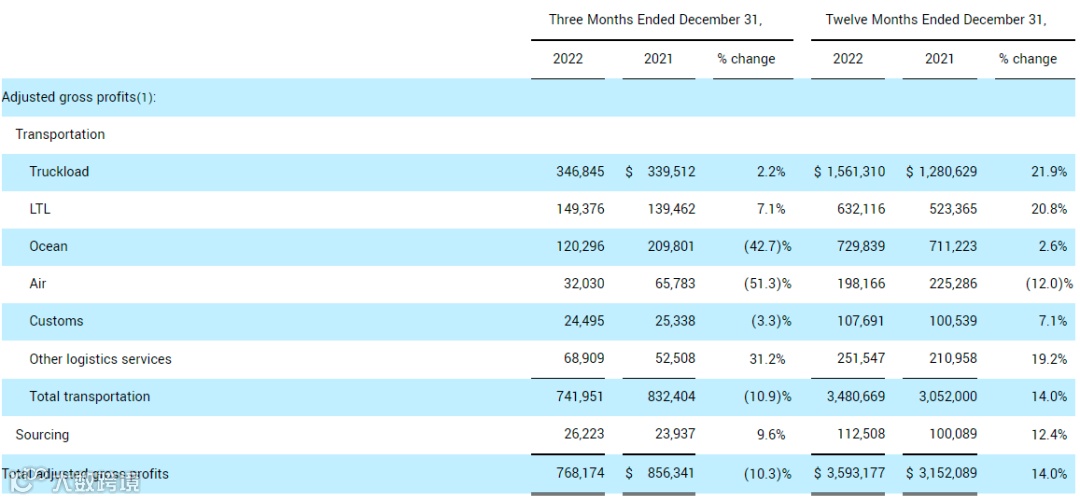 海运和空运均出现下滑:海运调整后毛利润下降42.7%,空运调整后毛利润下降51.5%,海关调整后毛利润下降3.3%。这三个部门的出货量和交易量都有所下降。