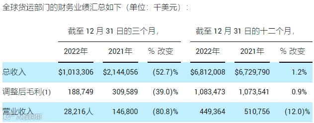 全球货运部门的总收入下降了52.7%,调整后的毛利润下降了39%,运营收入下降了80.8%。具体数字如下:总收入从21.4亿美元降至10亿美元;调整后毛利润从3.096亿美元下降至1.887亿美元;;运营收入从1.468亿美元降至2820万美元。