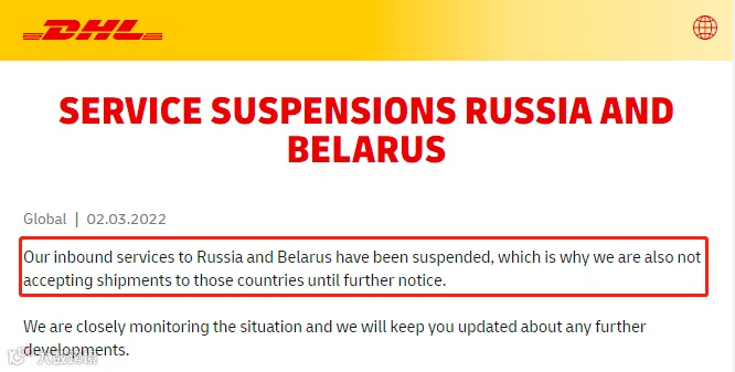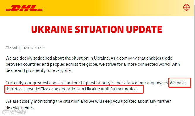 DHL对俄罗斯和白俄罗斯的入境服务已暂停,直至另行通知。此外,考虑到员工的安全问题。已关闭在乌克兰的办事处和业务,直至另行通知。