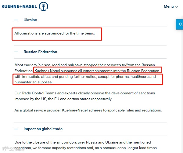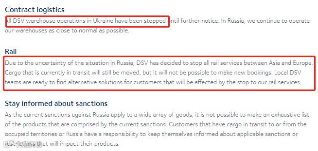 3月2日,德迅官网发布通知,已暂停乌克兰所有业务。大多数承运人(空运、海运、公路和铁路)已停止往返俄罗斯联邦的服务,德迅立即暂停所有进入俄罗斯的进口货物,并等待进一步通知,但制药、医疗保健和人道主义用品除外。德迅表示,由于俄罗斯和乌克兰空中走廊的关闭以及上述制裁,预计运力受限,因此交货时间会更长。