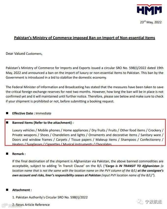 5月23日,HMM已发布相关紧急公告,禁止向巴基斯坦进口奢侈品或非必需品。并且立即生效。请在提交预订请求之前,查看以下内容并确保检查货物是否被禁止。