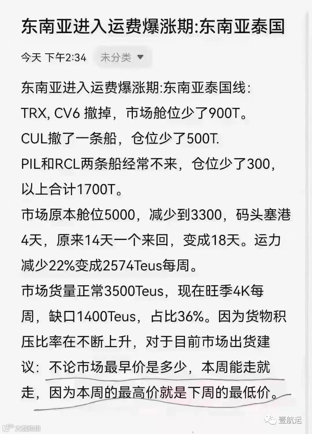 市场原本舱位5000,减少到3300,码头塞港4天,原来14天一个来回,变成18天,运力减少22%变成2574Teus每周;