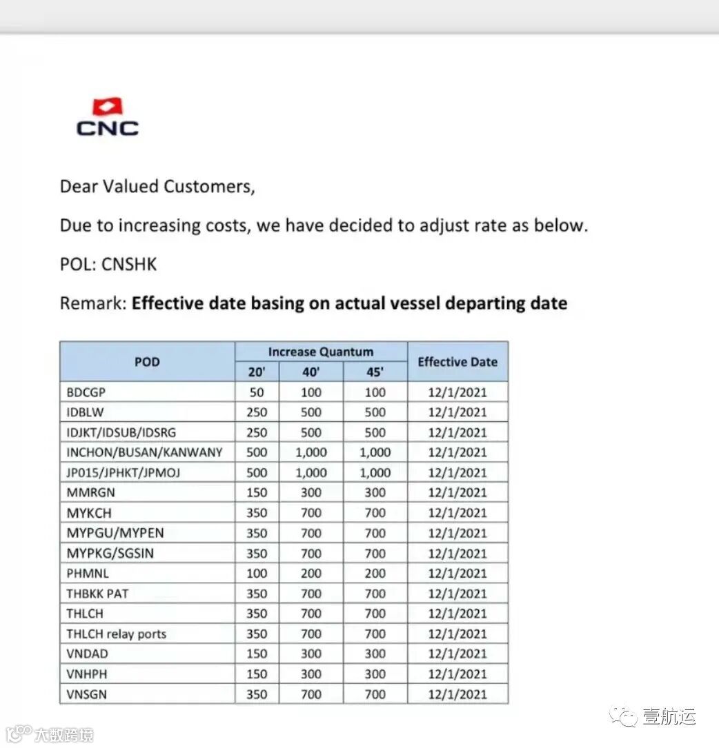 以下是达飞旗下专注亚洲市场的CNC本周刚刚发布的涨价通知,涨幅不小!