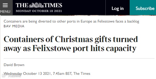 《泰晤士报》网站10月13日的头条文章写道,由于该国最大集装箱港口费利克斯托港容量已经饱和,一批装满玩具和电子产品的货船12日被调转至其他地方。“我不想自己看上去是个‘圣诞怪杰’,但今年的圣诞节货架将出现空缺。”一名货运公司负责人说。