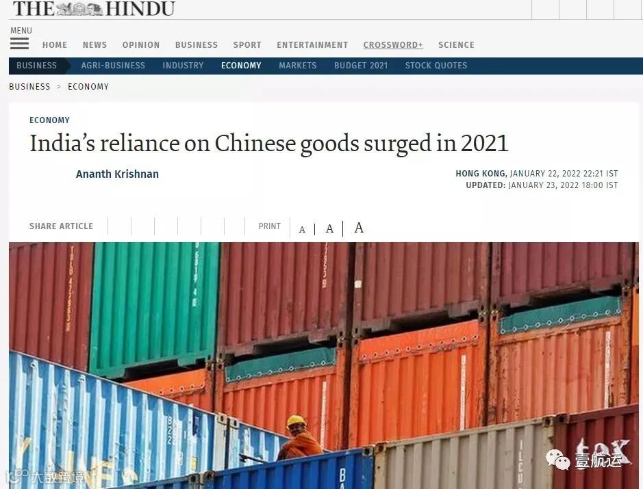 印度《印度教徒报》1月22日文章,原题:2021年印度对中国商品的依赖急剧增加 对贸易数据的分析显示,去年印度从中国进口的100大类商品(按价值计算)总值比此前一年增长近2/3,增幅为160亿美元,凸显印度对很多关键商品进口的依赖度越来越大。