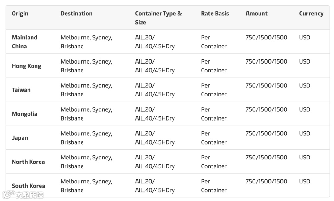 墨尔本、悉尼、布里斯班的所有货物,征收旺季附加费(PSS)。