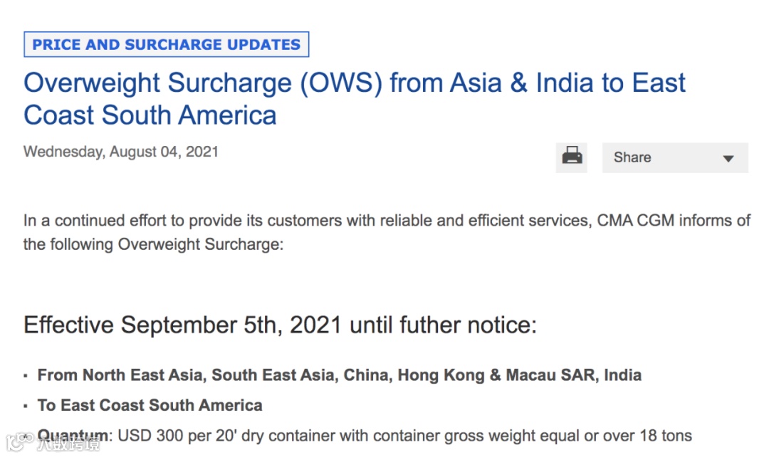 以及印度至南美东海岸的货物,上调超重附加费(OWS)。
