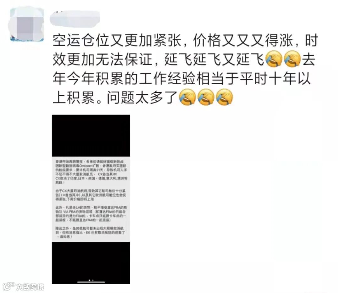 “空运仓位又更加紧张,价格又又又得涨,时效更加无法保证,延飞延飞又延飞,去年今年积累的工作经验相当于平时十年以上积累。问题太多了”