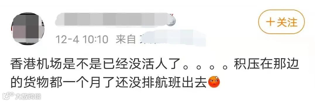 目前已经有网友反应,积压在香港机场的货物都一个月了还没排航班出去;有网友在网上提醒:“千万不要走HK的线路,一定要直走国内的航班,你永远也不知道大陆去香港通关要多久!”