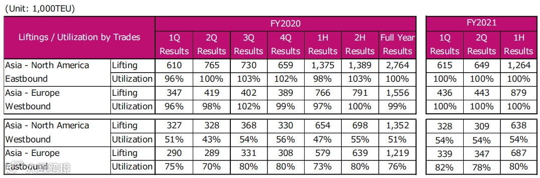 ONE表示,拥堵,尤其是美西码头夏季的拥堵,影响了货运量。2021财年上半年,亚洲-北美西行和东行航次的总载货量为190.2万teu,而去年为202.9万teu,略有下降。