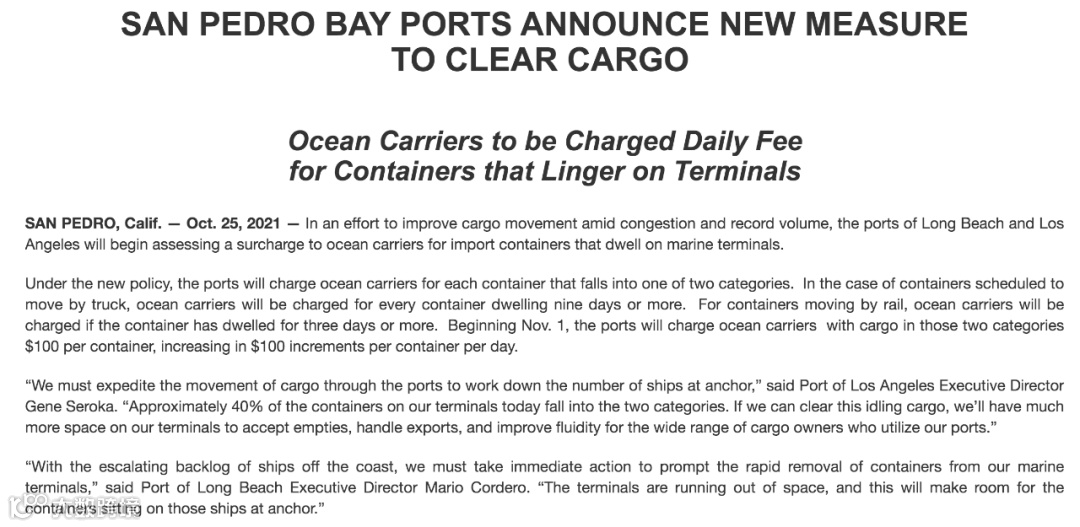 前几日我们曾报道过,美国洛杉矶港发布公告称,为提高美国港口作业效率,改善拥堵情况,洛杉矶港和长滩港将实行一项新政策——向船公司收取新附加费,适用于滞留在码头的进口集装箱。