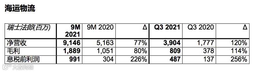 具体到海运物流业务,2021年前三季度,德迅实现净营收91.46亿瑞士法郎(约合99.53亿美元),同比增长77%;EBIT为9.91亿瑞士法郎(约合10.78亿美元),同比增长226%。