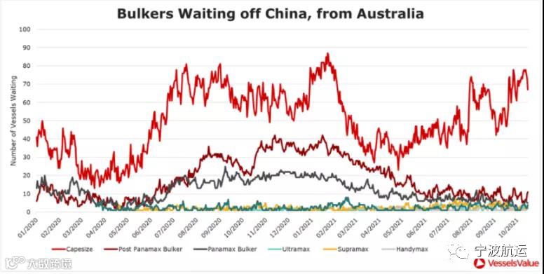 据 VesselsValue 数据显示,与 2020 年同期相比,2021 年前六个月,从澳大利亚至中国航线上好望角型和巴拿马型船减少了 17%,货运量减少了 14%,大量满载的散货船滞留在中国港口,等待卸货。