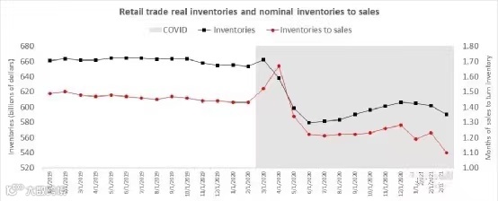 假设零售商希望在今年年底前将库存与销售比恢复到2019年的水平,Miller计算得出,他们需要将库存增加到4677.2亿美元,在3月底的4,371亿美元的基础上还要增加306.2亿美元。