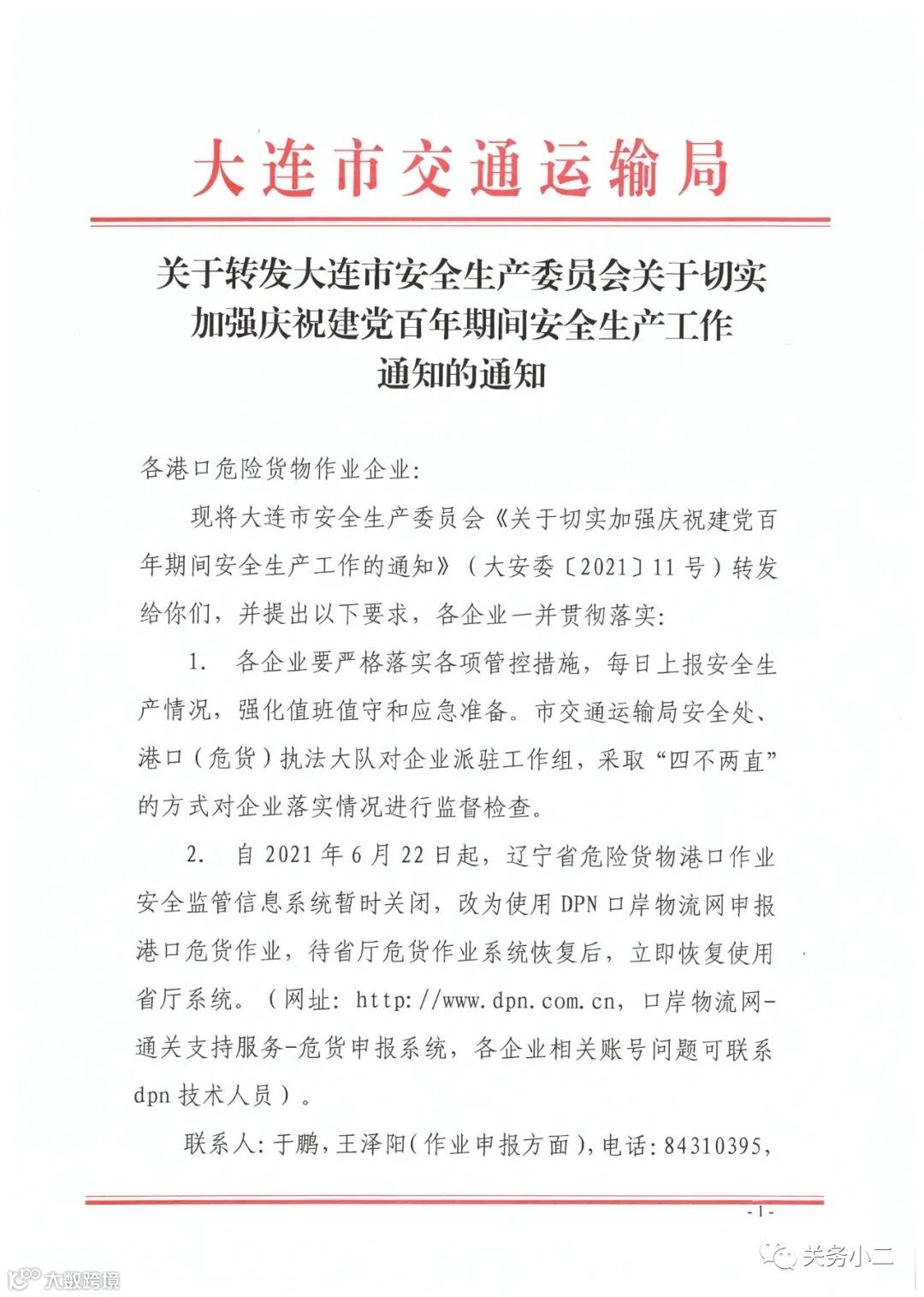 依据大连市安全生产委员会关于切实加强庆祝建党百年期间安全生产的工作要求,DCT码头将于6月21日至7月2日期间,暂停剧毒化学品、易制爆危险化学品装卸作业,具体如下: