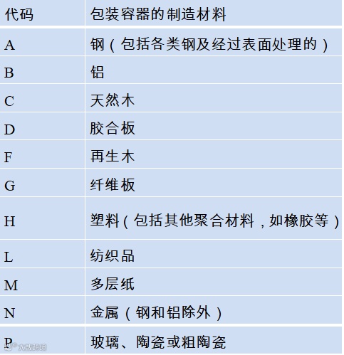 包装代码第二部分 大写英文字母,表示包装容器制造材料的性质。 |