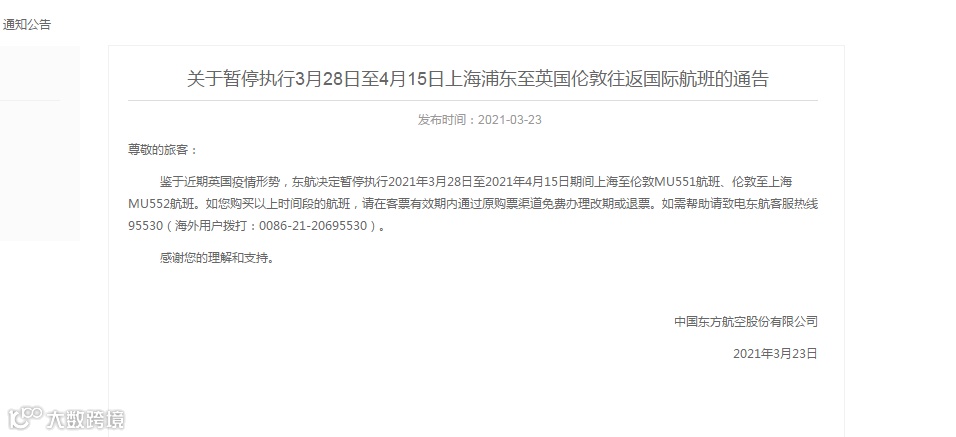 3月23日,东航发布公告,鉴于近期英国疫情形势,东航决定暂停执行2021年3月28日至2021年4月15日期间上海至伦敦MU551航班、伦敦至上海MU552航班。