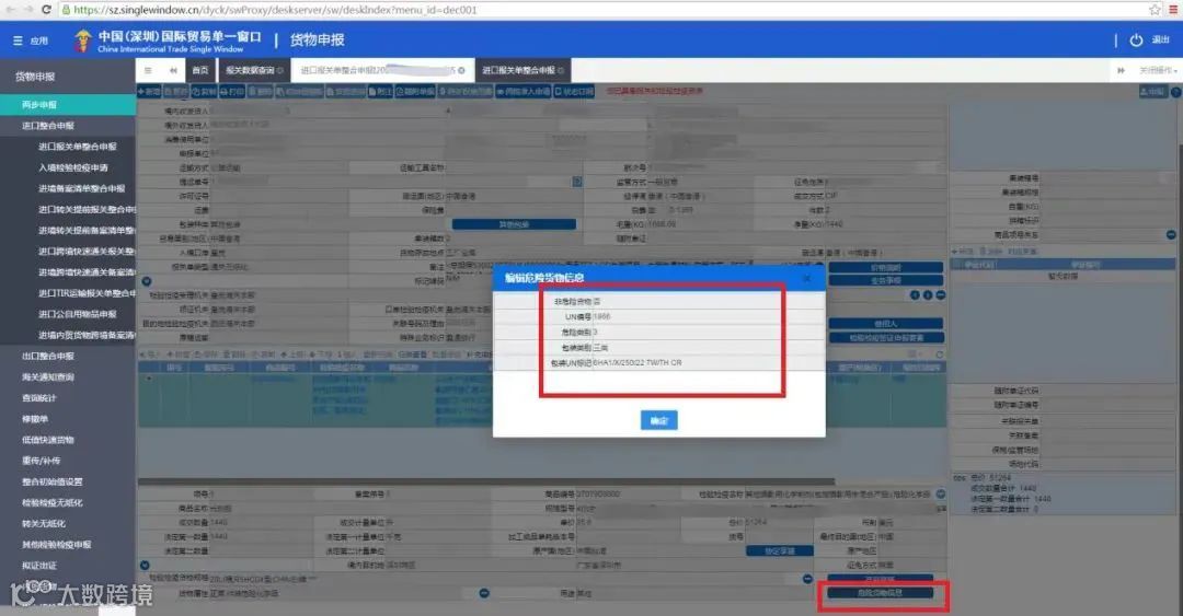 企业应如实选择正确的检验检疫名称,在货物属性栏中选择“件装(或散装)危险化学品”,并在随附单证中上传《进口危险化学品企业符合性声明》、中文危险公示标签(散装产品除外)和中文安全数据单的样本,对需要添加抑制剂或稳定剂的产品,应提供实际添加抑制剂或稳定剂的名称、数量等情况说明,属于危险货物的还需规范填写危险货物信息。如下图: