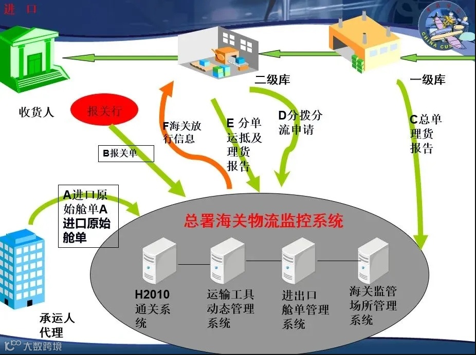 进口舱单传输流程:原始舱单入库—理货报告—分拨申请—分拨运抵报告—分运单理货报告—核注—核销—总运单放行。