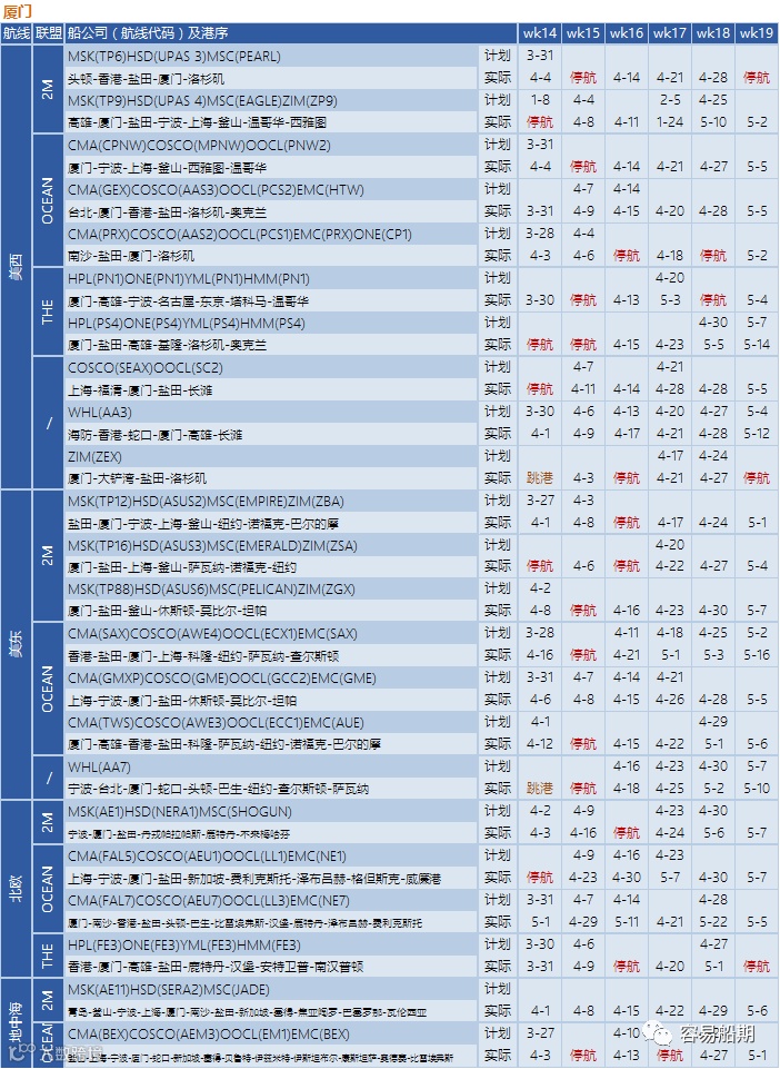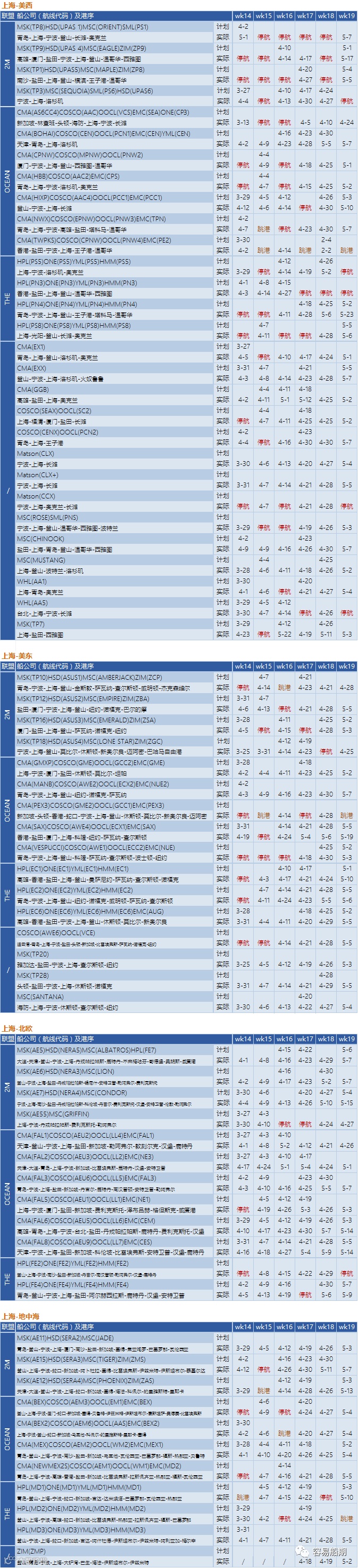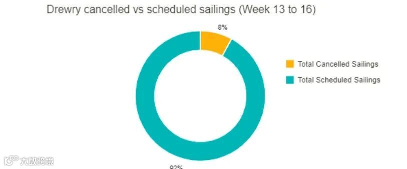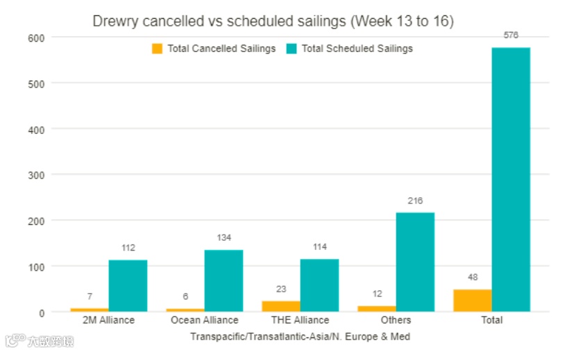 在跨太平洋、跨大西洋、亚洲-北欧和亚洲-地中海等主要航线总共576个预定航次中,在第13周至第16周之间取消了48个航次,取消率为8%。在此期间,75%的空白航行将发生在跨太平洋东向贸易航线中,主要是西海岸。