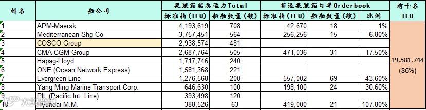 位列排行榜第四至第十分别是:达飞轮船(第4)、赫伯罗特(第5)、ONE(第6)、长荣海运(第7)、阳明海运(第8)、太平船务(第9)、现代商船(第10)。全球排名前10的班轮公司运力达到1958.1744 万TEU,占全球100大集装箱班轮公司的86%。
