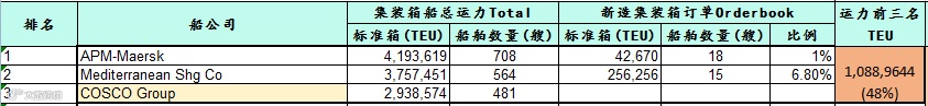全球班轮公司运力排名前三依然是马士基航运(419.3619 万TEU)、地中海航运(375.7451 万TEU)以及中远海运集团(293.8574 万TEU),这三大班轮公司总运力占市场份额的48%。