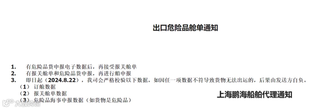 随后,上海各船舶代理公司相继发布了”关于出口危险品货物预配舱单申报要求“的通知。