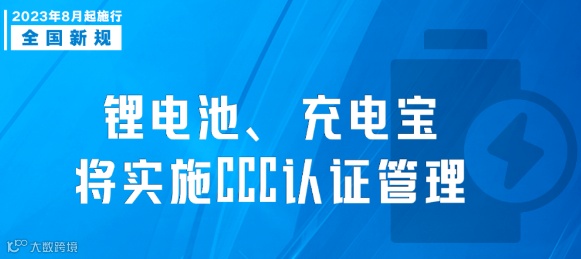 市场监管总局发布2023年第10号公告,自2023年8月1日起对锂离子电池和电池组、移动电源实施CCC认证管理。自2024年8月1日起,未获得CCC认证证书和标注认证标志的,不得出厂、销售、进口或者在其他经营活动中使用。原文链接:https://mp.weixin.qq.com/s/2D_cPiS1-dX7BFucDLoaeA