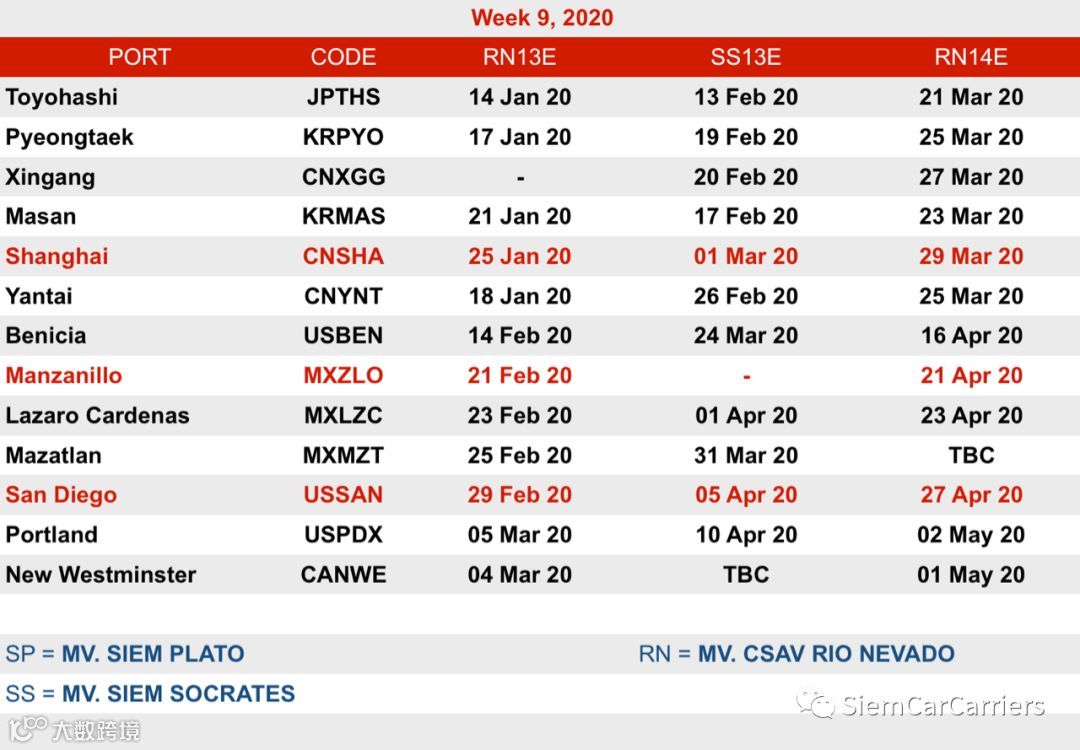 SCC 泛太平洋 RoRo 船期表 - 2020年第9周