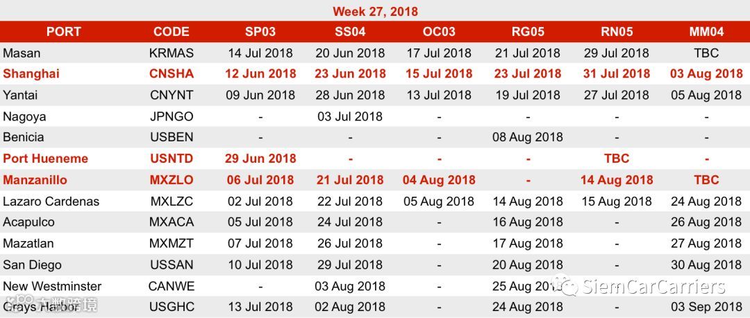 导读:SCC Trans Pacific RoRo Schedule - Week 27, 2018