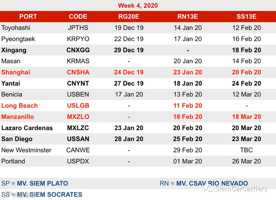 SCC 泛太平洋 RoRo 船期表 - 2020年第4周