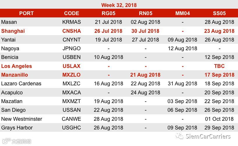 导读:SCC Trans Pacific RoRo Schedule - Week 32, 2018