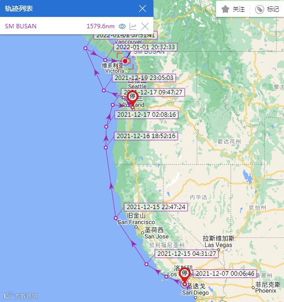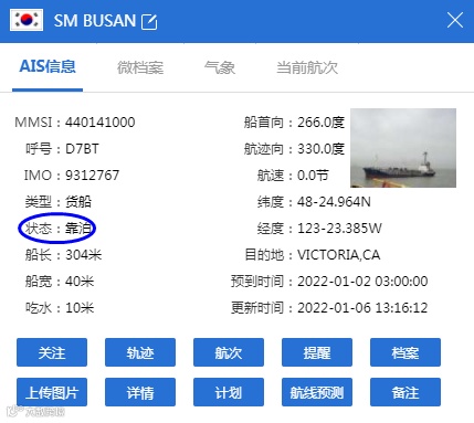 截止目前,该船仍位于加拿大维多利亚,处于靠泊状态,预计原定船期将延误。提醒配载该船的货主货代务必及时沟通并关注进展,掌握船期延误情况等。