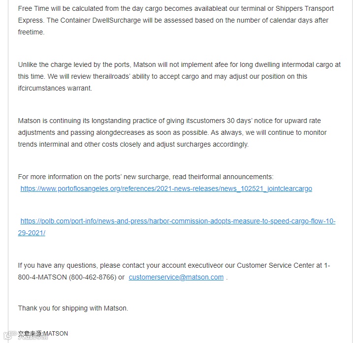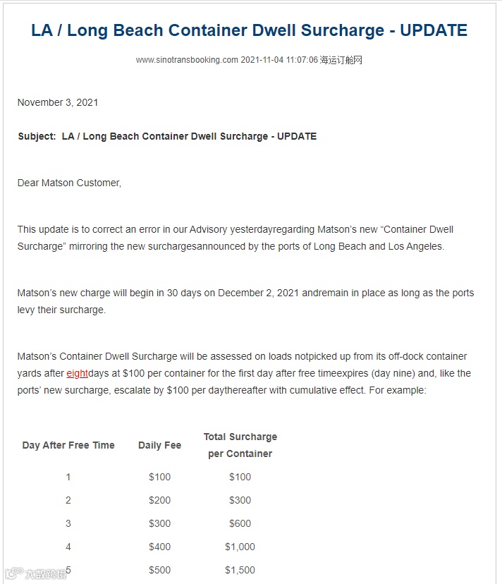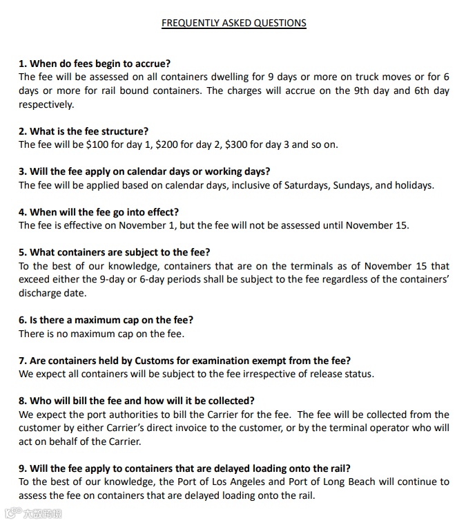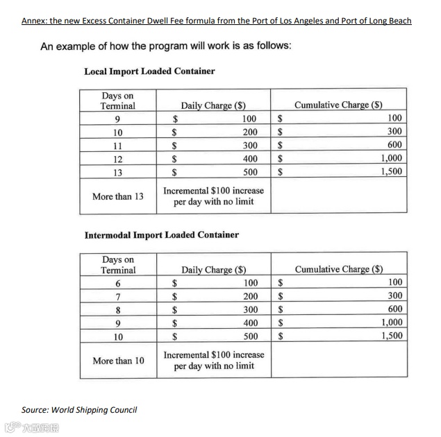 对于目的地在美国内陆的进口重箱(由铁路中转至内陆),如果在卸货后的6天或以上重箱未被提取,将被洛杉矶/长滩港务局征收费用。