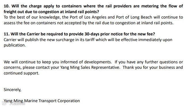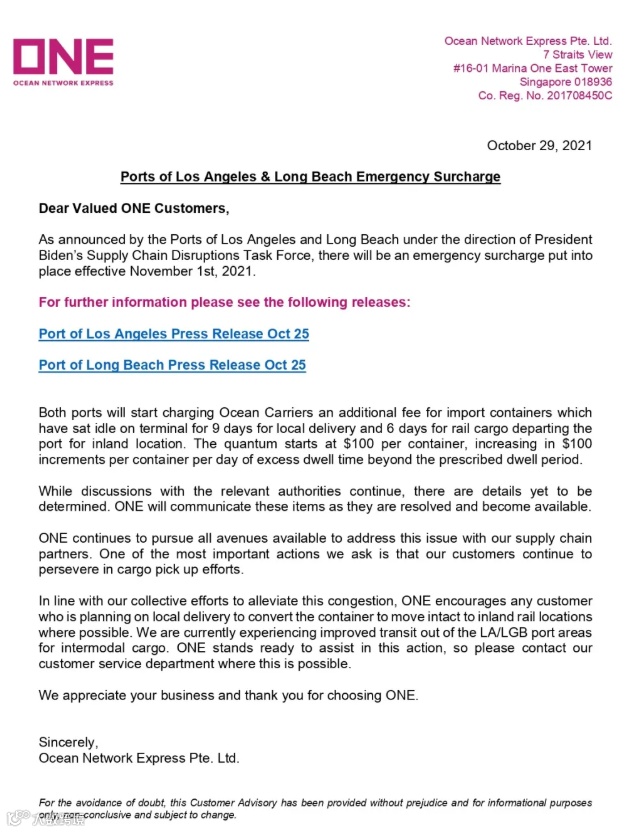 ONE则对此发布公告称,仍在与港口和相关方讨论最新政策的具体实行问题,但有关费用如何收取等细节尚未确定。ONE还鼓励在当地交付货物的客户,将集装箱转运到内陆铁路地点。