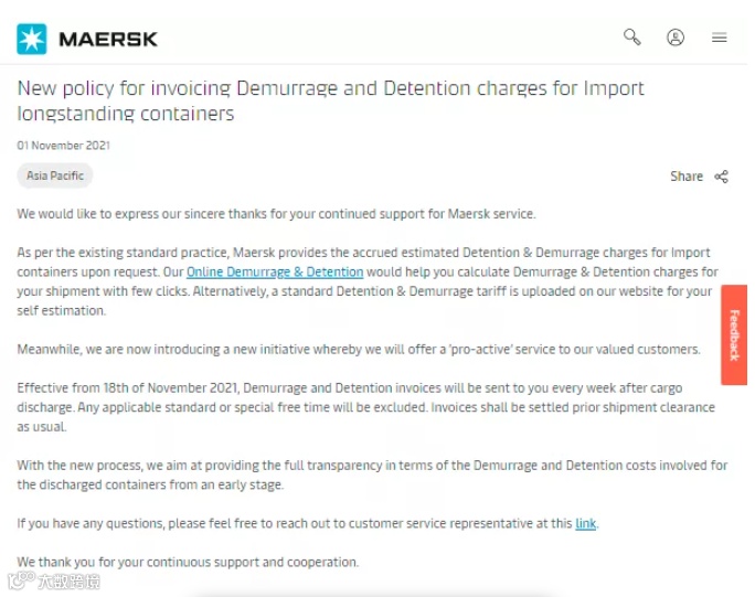 马士基也发布公告称,其正在与相关方积极合作,充分了解新政策的相关问题,积极研究多种解决方案,以减轻新政策带来的负面影响。与此同时,正在推出一项新举措,将为客户提供“积极主动”的服务。自2021年11月18日起,卸货后每周都会向客户发送滞期费和滞留费发票。任何适用的标准或特殊的空闲时间将被排除在外。发票应照常在装运清关前结算。