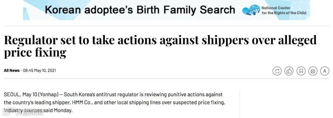 对于上述调查,韩国航运业反驳称,根据韩国《海运法》,允许船东采取共同行为。