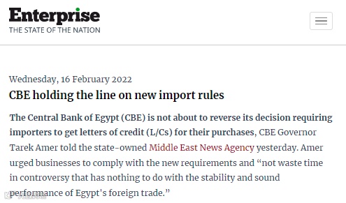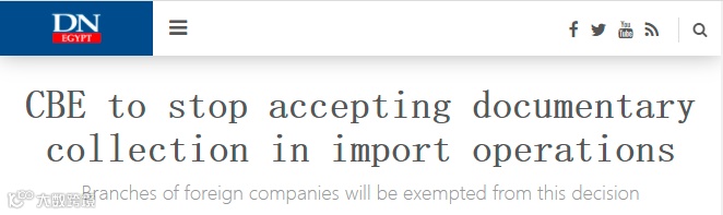 埃及中央银行(CBE)决定,从3月份起,埃及进口商仅可使用信用证进口商品,并指示银行停止处理出口商托收单据。