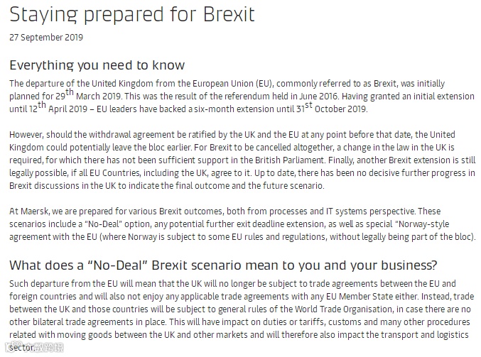受英国脱欧影响,日前一些船公司发布了紧急通知。马士基和海洋网联(ONE)日前发布通知,提醒客户做好英国脱欧的准备。