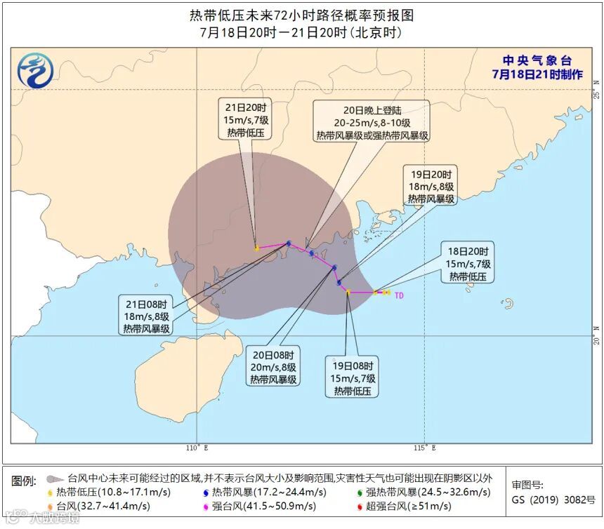 预计,该低压中心将回旋少动,强度逐渐加强,有可能发展为今年第7号台风,20日白天在广东中西部沿海登陆(热带风暴级或强热带风暴级,8-10级,20-25米/秒);也有可能在广东中西部近海海面徘徊少动,而后向东北方向移动。