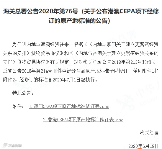 为促进内地与港澳经贸往来,根据《〈内地与澳门关于建立更紧密经贸关系的安排〉货物贸易协议》和《〈内地与香港关于建立更紧密经贸关系的安排〉货物贸易协议》有关规定,对海关总署公告2018年第213号和海关总署公告2018年第214号附件中部分商品原产地标准予以修订,详见公告附件1和附件2。自2020年7月1日起实施。