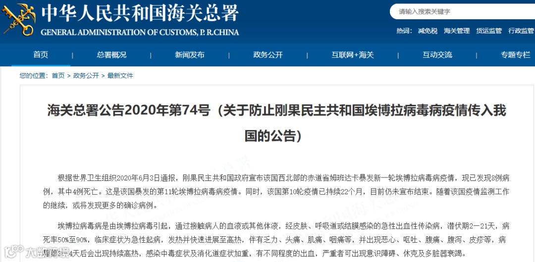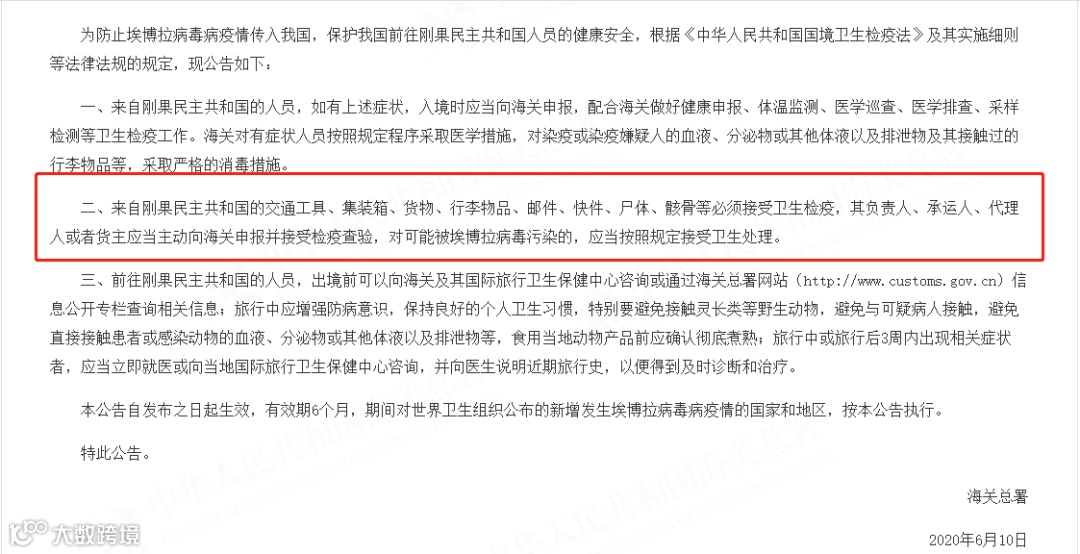 近期,刚果民主共和国暴发第11轮埃博拉病毒病疫情。为防止埃博拉病毒病疫情传入我国,保护我国前往刚果民主共和国人员的健康安全,根据《中华人民共和国国境卫生检疫法》及其实施细则等法律法规的规定,海关总署对来自刚果民主共和国的人员、交通工具、集装箱、货物、行李物品、邮件、快件、尸体、骸骨等规定严格的卫生检疫措施。自2020年6月10日起实施。