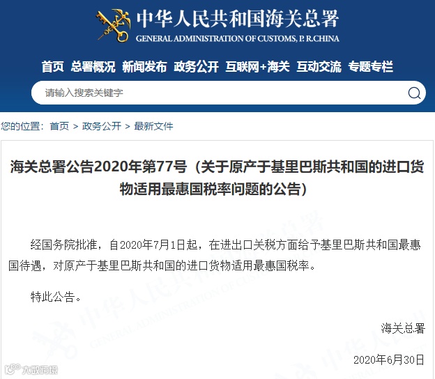 经国务院批准,自2020年7月1日起,在进出口关税方面给予基里巴斯共和国最惠国待遇,对原产于基里巴斯共和国的进口货物适用最惠国税率。特此公告。自2020年7月1日起实施。