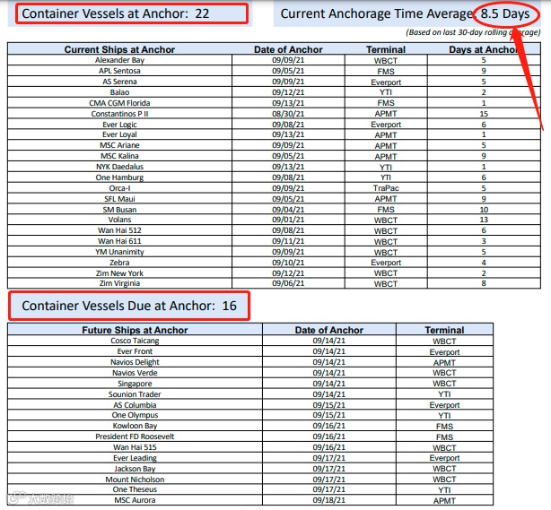 据洛杉矶港signal平台14日的最新数据,目前在南加州锚地等待泊位的集装箱船达到22艘,在港外等待的船舶更是达到16艘,等待的船舶达到38艘,平均等待靠泊时间由一周前的8.1天增加至8.5天,等待时间最长可达16天。这种“拥堵”现象已导致多地货品短缺、物流延时、物价上涨。