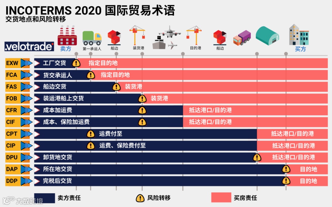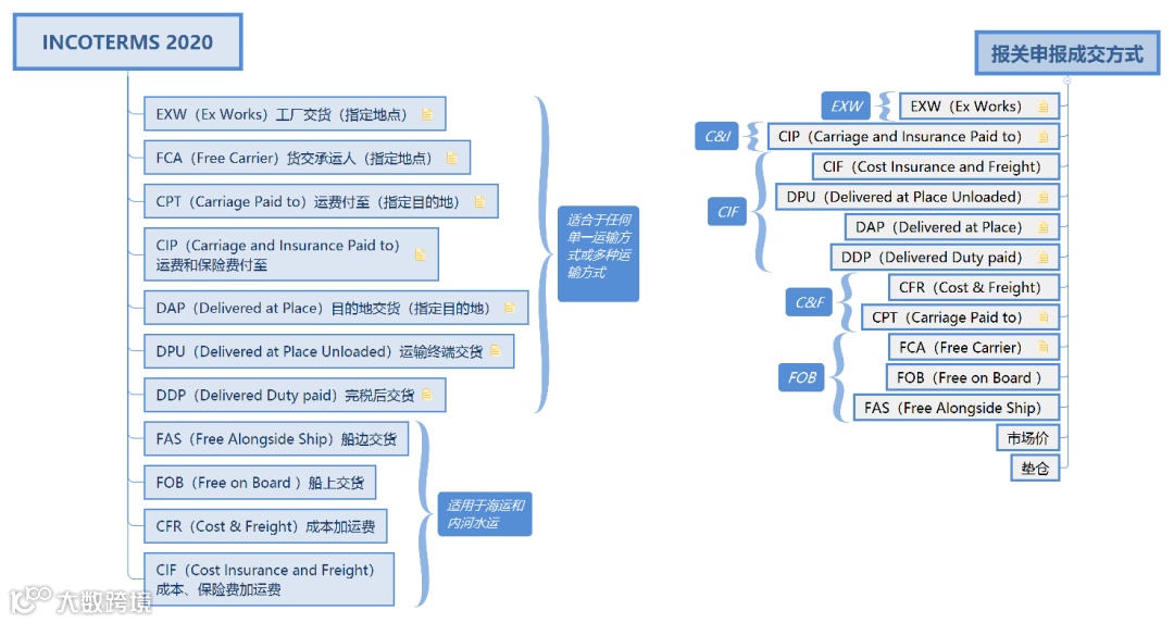 国际商会(ICC)制定的国际贸易术语(INCOTERMS 2020)中有11种成交方式: