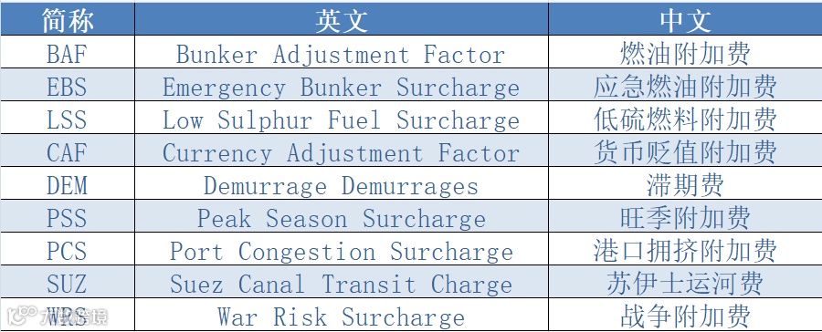 海运附加费(Surcharges)是船公司在基本费率之外,为了保持在一定时期内基本运费费率的稳定,又能正确反映出各条航线运输货物的航运成本,弥补损失而规定的各种额外加收的费用。