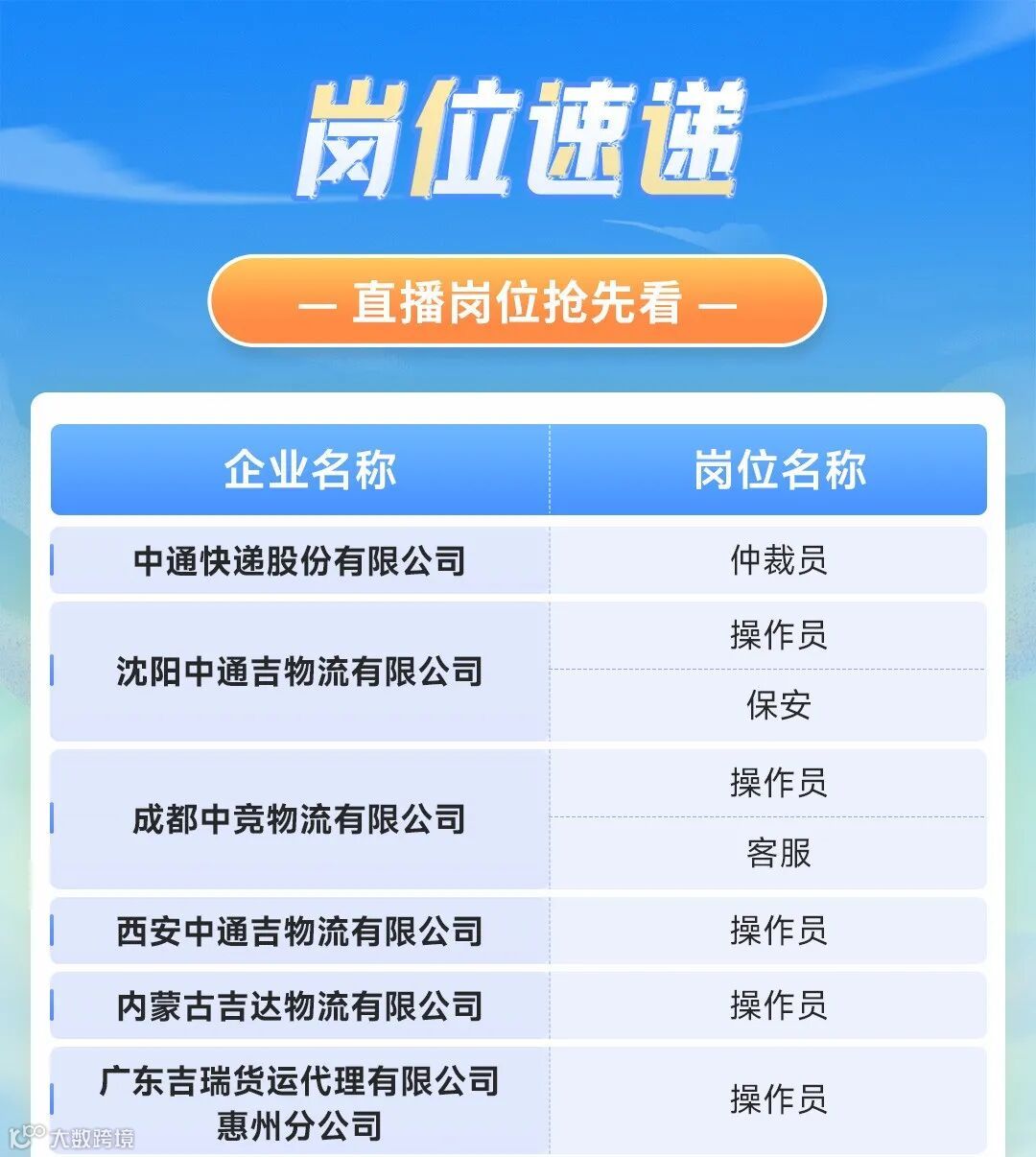 本次快递行业专场直播主播将为您解读求职应聘技巧;同时中通快递股份有限公司等10家快递企业为求职者提供多种类型的优质岗位。