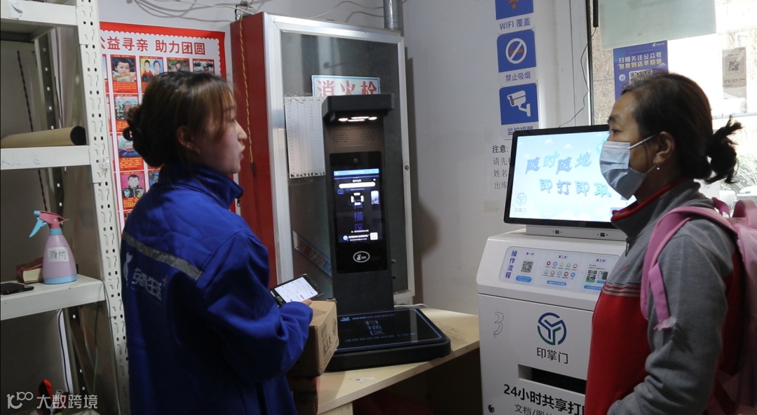 门店店员在向取件客户介绍公益寻亲项目