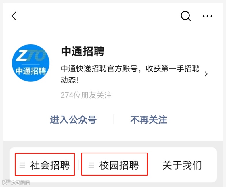 感谢您关注“中通招聘”微信公众号,这里为您提供最新鲜的招聘资讯和最便捷的招聘服务,覆盖社会招聘、校园招聘、实习生招聘、内部推荐、雇主品牌宣传等,希望更多优秀人才加入中通。
